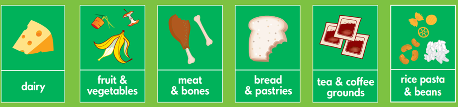 This includes raw meat, cooked meat and bones, fish, cooked fish and bones, gristle, dairy products, cheese and eggs, teabags and coffee grounds, rice, pasta and beans, baked good (such as bread, cakes and pastries), raw vegetables, cooked vegetables, whole fruit and peelings and pet food.