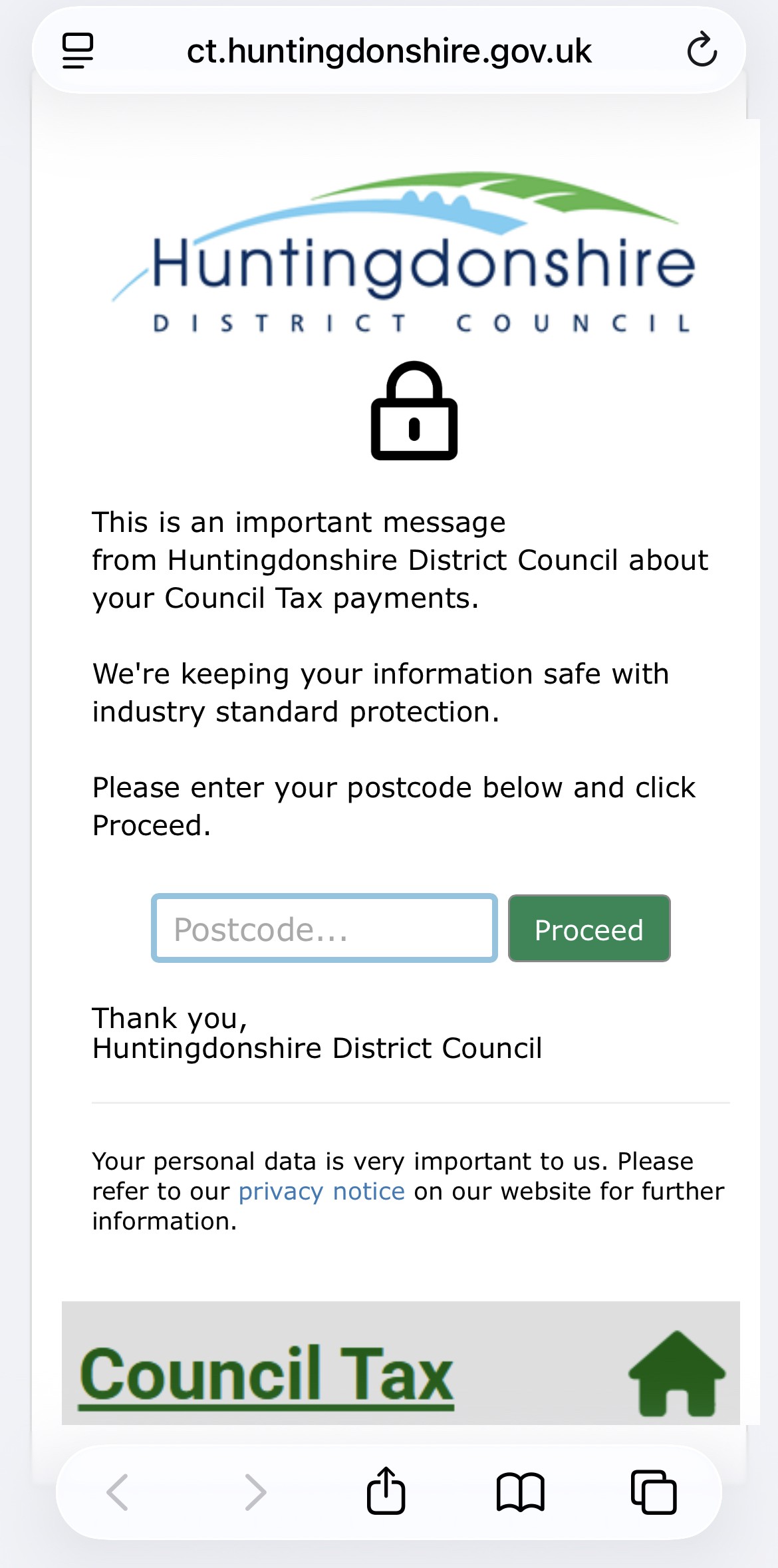 We will never ask you for your bank account details. The link in our messages will always start with ct.huntingdonshire.gov.uk (please note - you cannot reply to this email address).