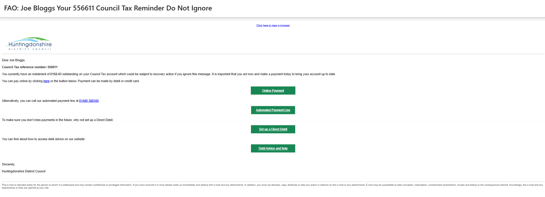 Emails will come from council.tax@huntingdonshire.gov.uk with the subject line: Your Council Tax Reminder - Do Not Ignore.